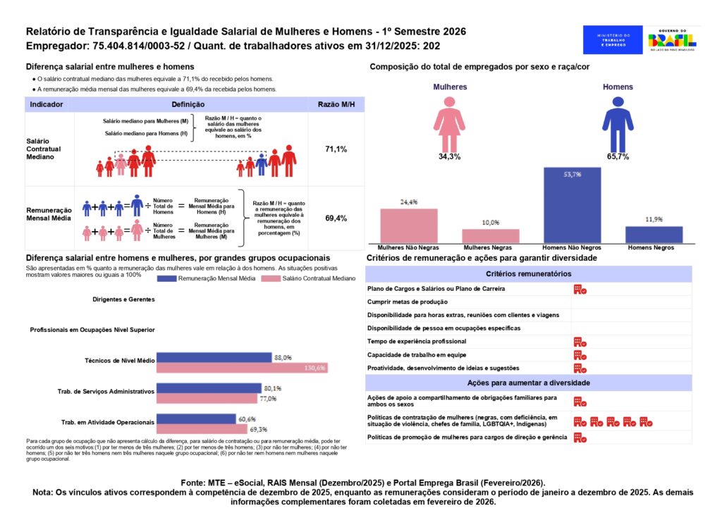 Atendendo à Lei nº 14.611/2023, disponibilizamos publicamente os salários e critérios de remuneração adotados na empresa. Queremos que qualquer pessoa — colaboradores, candidatos ou público externo — possa consultar essas informações.